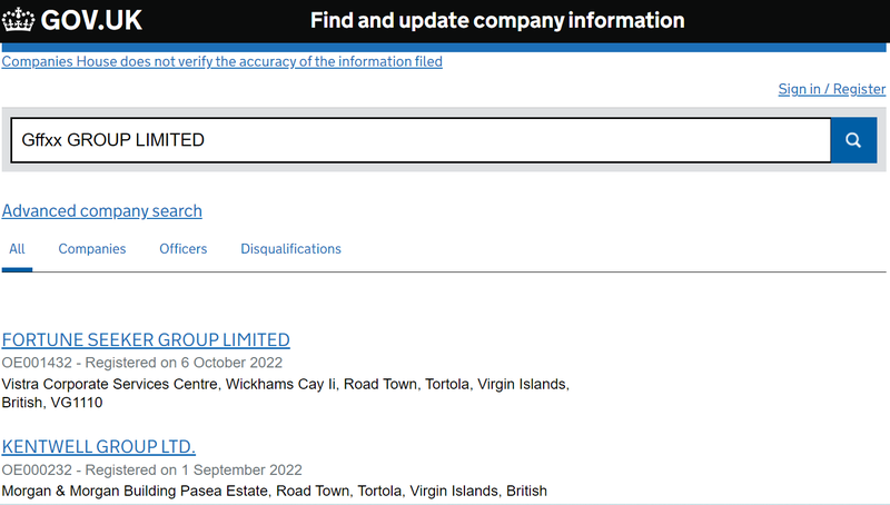 2. Is Gffxx’s headquarters in London? While Gffxx claims its headquarters is in London, no registration information appears in Companies House, suggesting that this claim may be false.