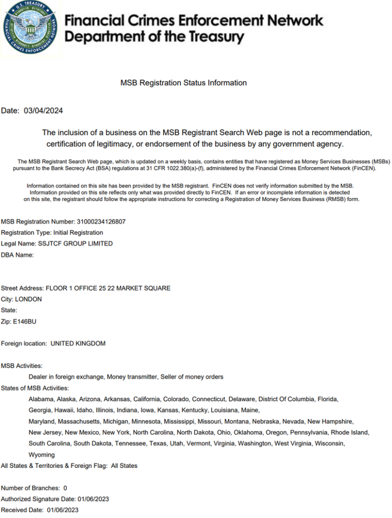 Gffxx claims on its website to be registered with the Financial Crimes Enforcement Network (FinCEN) in the United States, with an MSB number of 31000234126807. FinCEN is responsible for combating money laundering and other financial crimes, and an MSB number typically signifies a legitimate financial institution. However, upon verification, this MSB number actually belongs to a company named SSJTCF GROUP LIMITED, not Gffxx GROUP LIMITED. This indicates that Gffxx does not possess any valid U.S. regulatory authorization, making its regulatory claims completely misleading.