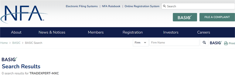 1.U.S. Commodity Futures Trading Commission (CFTC) and National Futures Association (NFA): The CFTC oversees the U.S. futures market, and the NFA, under CFTC supervision, handles the registration and oversight of futures brokers. A search on the NFA website found no evidence of a registered entity named TradExpert-mxc. This indicates that the platform does not hold CFTC regulatory approval, and its claimed New York headquarters have not been verified.