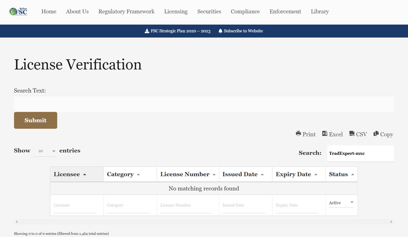 2.Belize Financial Services Commission (IFSC): IFSC regulates financial services companies in Belize, especially in the forex and CFD markets. A database search within IFSC’s records showed that TradExpert-mxc is not listed as a registered company.