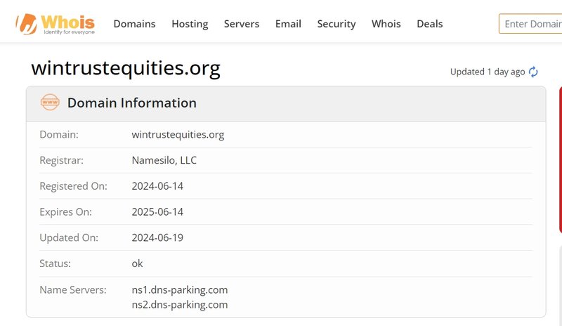 A Whois search shows that the Wintrust Equities domain was registered on June 14, 2024. This indicates that the platform has only been operating for a few months. Compared to well-established financial platforms that have been around for years, Wintrust Equities lacks the operational history necessary for investors to gauge its stability and security. This short domain registration time suggests that the platform has not been adequately tested in the market, leaving investors with little user feedback or transaction records to evaluate its quality and safety.