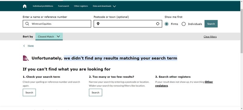 Wintrust Equities also claims to be regulated by the UK’s FCA. However, a search of the FCA’s website reveals no records of this company. This means Wintrust Equities’ claim of FCA regulation is false. The FCA is one of the most recognized financial regulators globally, known for its strict qualification checks and oversight. Since Wintrust Equities is not regulated, its operations lack transparency, and it presents itself as a high-risk platform.