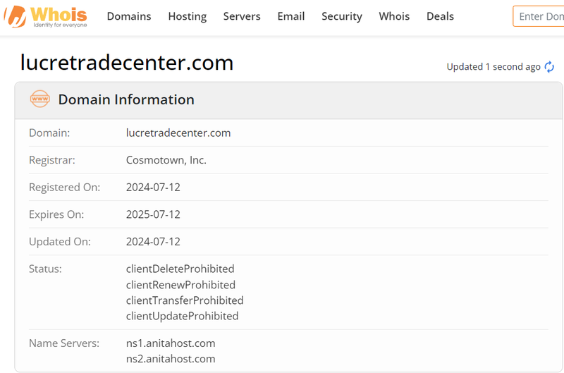According to WHOIS data, Lucretradecenter’s website domain, www.lucretradecenter.com, was registered on July 12, 2024. This date contradicts the company’s claim of being founded in 2009. The domain registration date is 15 years later than the claimed establishment date, suggesting that the platform may not have the long operational history it claims.