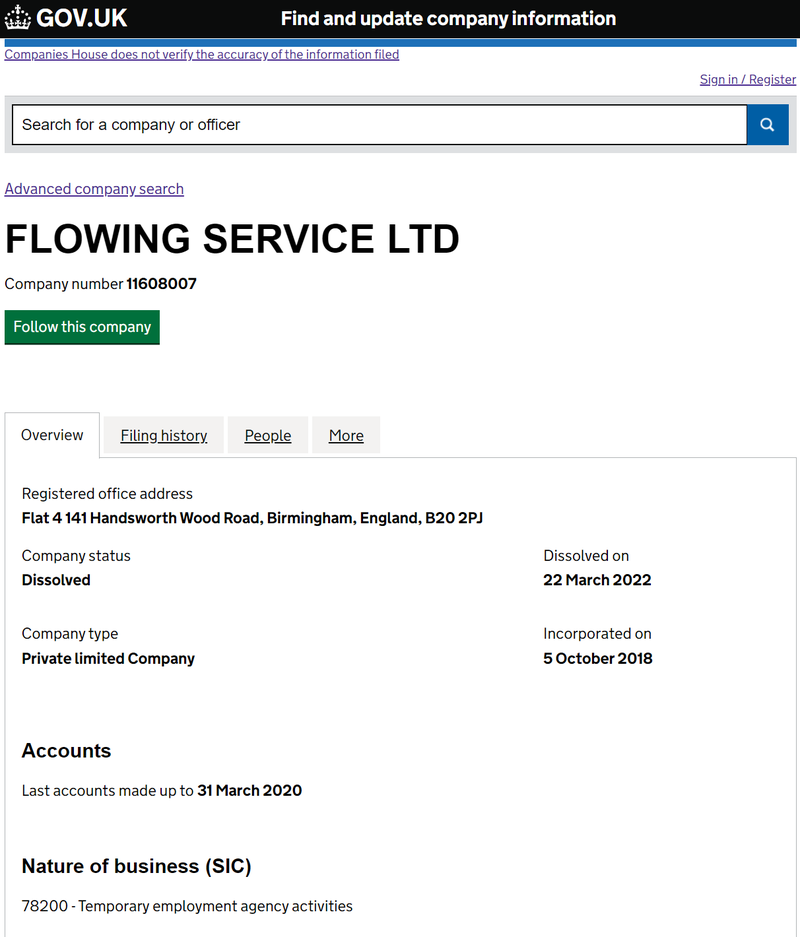 A search on the UK’s Companies House shows that the entity with registration number 11608007 is FLOWING SERVICE LTD, not Lucretradecenter. Furthermore, FLOWING SERVICE LTD dissolved on March 22, 2022. The UK Companies House database shows no record of a company named Lucretradecenter. Additionally, a search in the Australian Business Register (ABR) revealed that there is no company with the registration number 2018AD947.