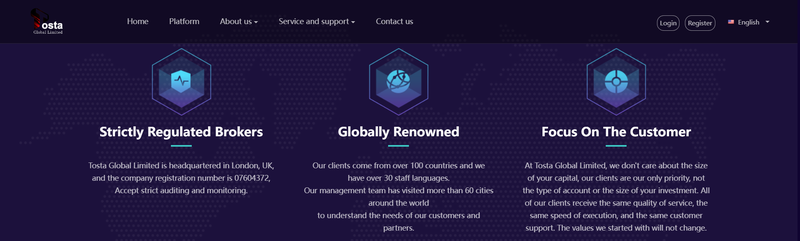 Tosta Global Limited claims to be a CFD broker offering trading in stocks, cryptocurrencies, forex, etc., but its legitimacy and regulatory status are questionable.
