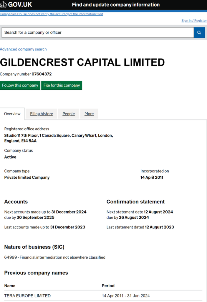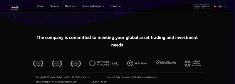 According to information on Tosta Global Limited’s website, the company claims to be headquartered in London and provides a company registration number (07604372), stating it is regulated by the UK Financial Conduct Authority (FCA) under license number 564741. However, upon checking with Companies House and the FCA’s official website, this registration number and license actually belong to GILDENCREST CAPITAL LIMITED. This suggests that Tosta Global Limited may be fraudulently using the registration information and regulatory details of another company to falsely establish legitimacy.