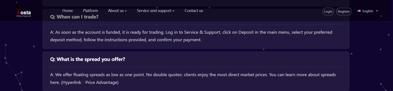 Tosta Global Limited’s website only mentions floating spreads starting from 1 pip, while omitting essential information such as account types, trading commissions, minimum and maximum trade sizes, position limits, leverage, margin requirements, and contract specifications. Lack of detailed account information may imply hidden fees or limitations imposed on investors during trading.