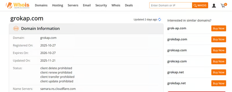 According to Whois domain records, the grokap.com domain was registered in late October 2025, indicating that the platform has been operating online for a relatively short period.