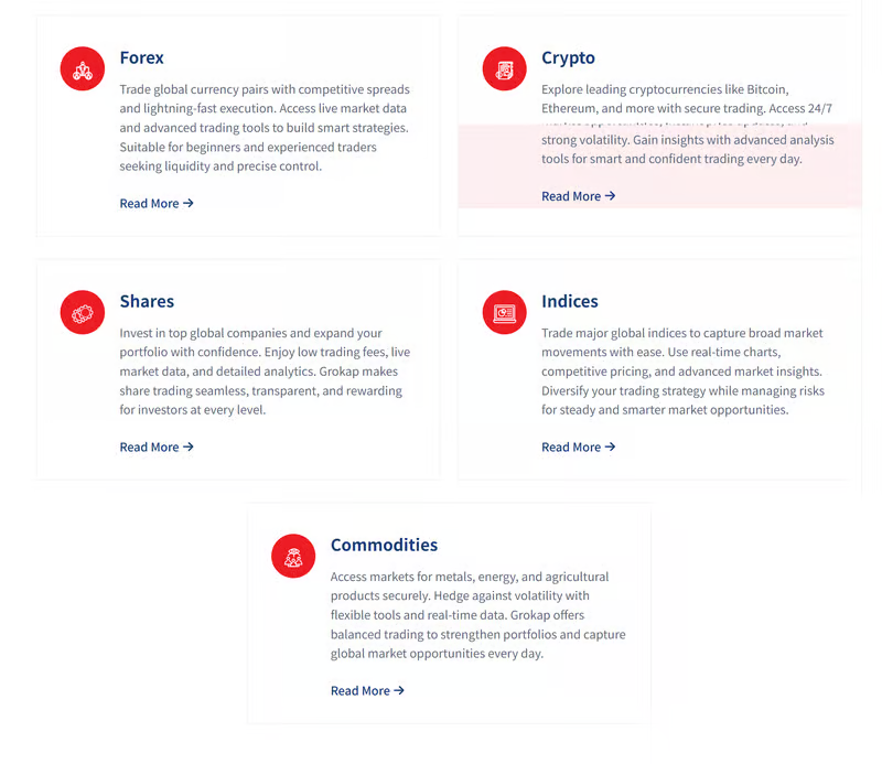 According to information published on its website, Grokap offers trading access to major global markets, including currency pairs, digital assets, equities, indices, and commodity instruments. This product range is consistent with what is typically seen on multi-asset trading platforms targeting retail users.