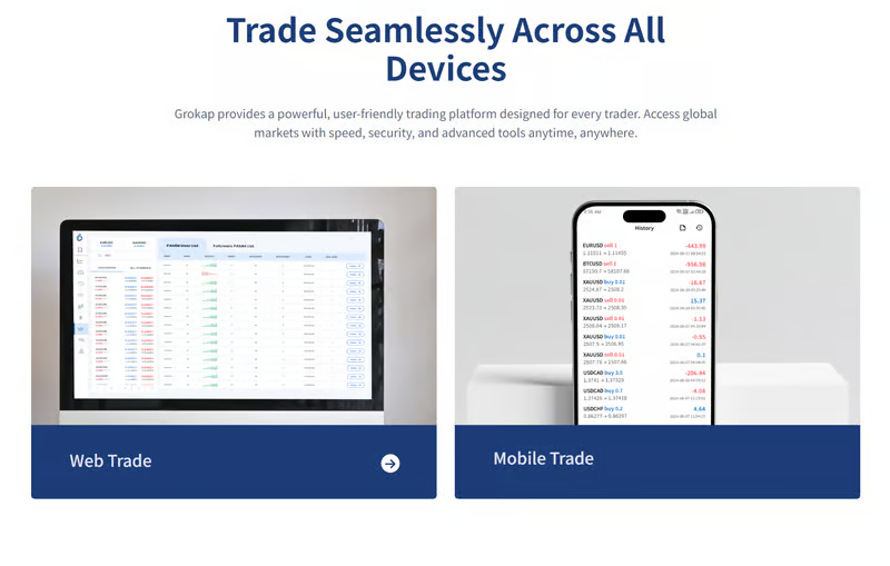 Grokap offers a browser-based trading platform that does not require software installation, as well as a mobile application for account access and position management.