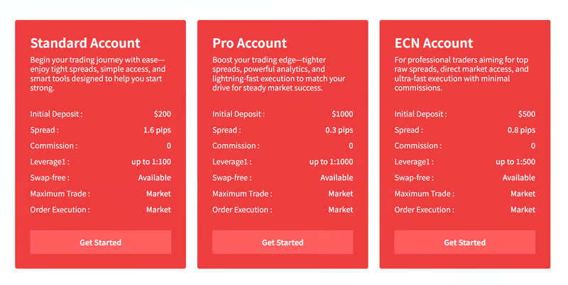 The platform lists Standard, Pro, and ECN account types, which are described as differing in deposit requirements, spreads, and leverage. Detailed contractual terms are limited on the website.