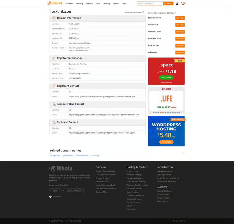 WHOIS data indicates that the domain forxbnk.com was registered on December 28, 2025, with the latest update also recorded on December 28, 2025. This suggests the domain has only recently entered active circulation, meaning its observable online footprint and operational history are currently limited.