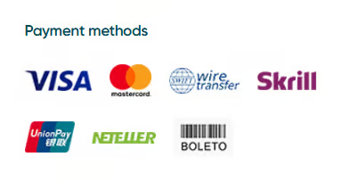 VISA, Mastercard, Wire Transfer, Skrill, UnionPay, NETELLER, and BOLETO.