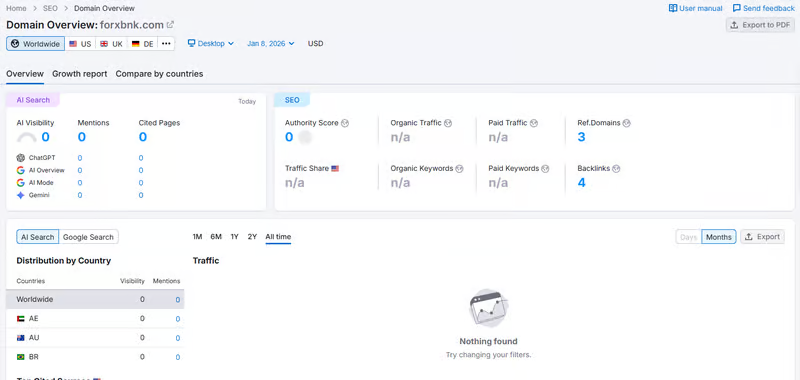 Based on Semrush statistics, Forxbnk currently shows limited organic search visibility and does not appear to have a stable keyword ranking footprint. Both domain authority signals and search coverage are relatively low, which suggests early-stage exposure in public search ecosystems.